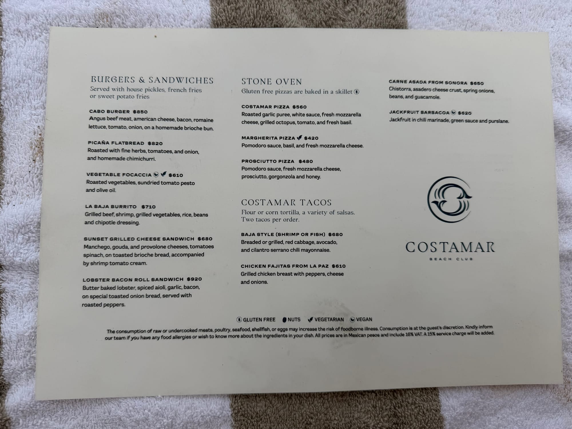 Outside of breakfast, we had lunch at Costamar, the PH’s “Beach Club.” Food is extremely expensive on site; $30 for a plain salad and $47 for a burger, plus 15% service charge. So outside of a huge breakfast, we generally ate out of the resort. My wife had the thought of ordering from the kid’s menu when she wanted something to eat but wasn’t starving, and honestly, it was a pretty large amount for a significant savings. Tacos were about $20, vs $37 for adult tacos, and it was 3 tacos of adult taco sizing.